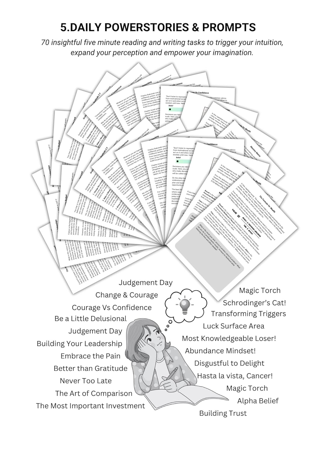 Experience self-discovery and growth through inspiring stories, unique concepts, and insightful prompts. This section helps you go deeper, gain clarity, and explore your potential in just a few minutes a day.